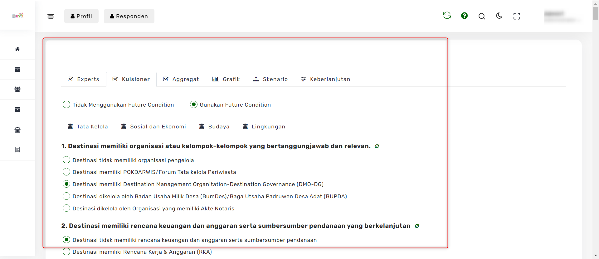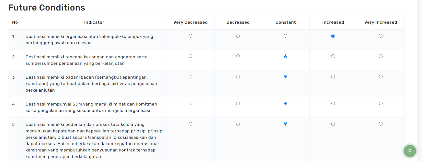 Apabila pada kuisioner memilih future condition maka pada bagian bawah akan tersedia pilihan ganda untuk meningkatkan atau menurunkan indicator yang akan berpengaruh pada grafik naik atau turunnya status aspek