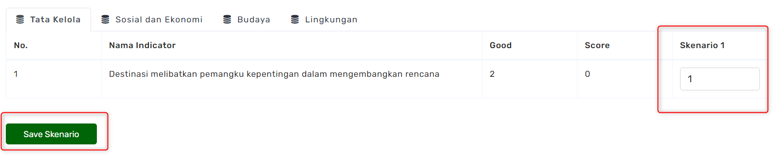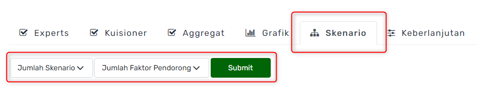 Pilihlah menu Skenario, Pastikan telah melakukan pengisian kuisioner sebelum melakukan skenario. Kemudian pilih berapa skenario yang akan digunakan beserta berapa Indicator pendorong yang akan ditingkatkan